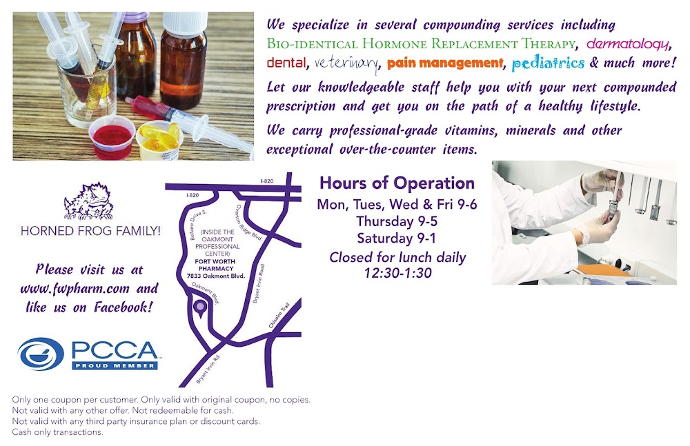 Here are Fort Worth Pharmacy, LLC – Compound Specialty Pharmacy's opening hours, and please note that our hours may vary, so it's best to get in touch with us before planning your visit.